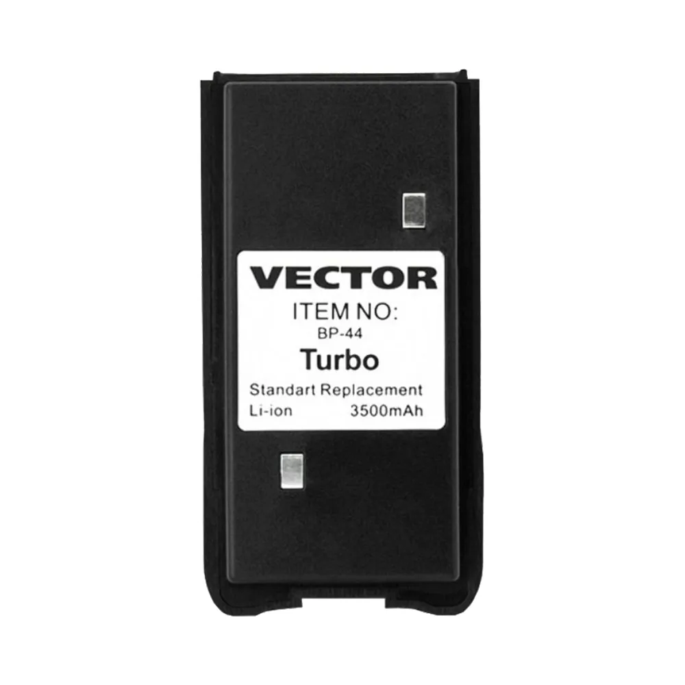Литий-ионный аккумулятор VECTOR BP-44 (Turbo) имеет повышенную ёмкость - 3500 мАч. Совместим с радиостанцией Vector VT-44 Turbo.