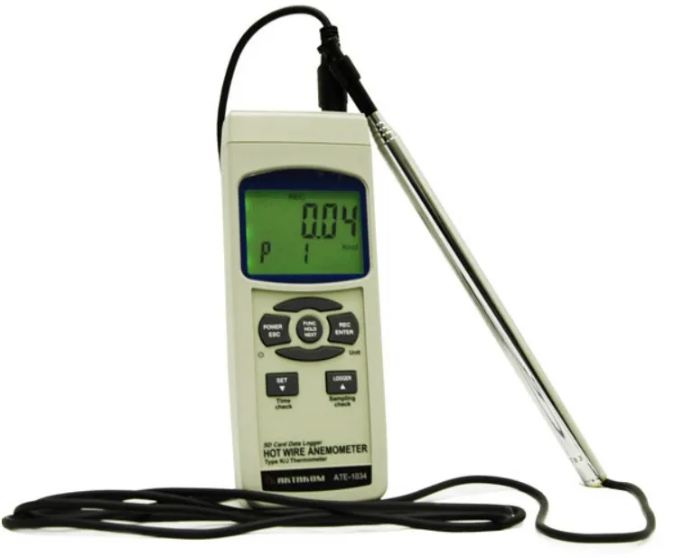 Портативный анемометр АТЕ-1034 является удобным инструментом для измерения параметров воздушного потока как на вентиляционных решетках, так и непосредственно в воздуховодах. Анемометр АТЕ-1034 работает по принципу охлаждения воздушным потоком нагретой нити. Одной из особенностей анемометра АТЕ-1034 является выносной датчик — миниатюрный стеклянный термистор, который размещается в малогабаритной измерительной головке диаметром 12 мм на телескопической ручке, благодаря чему его можно использовать для измерений в труднодоступных местах. Помимо скорости воздушного потока, анемометр АТЕ-1034 позволяет измерять температуру.