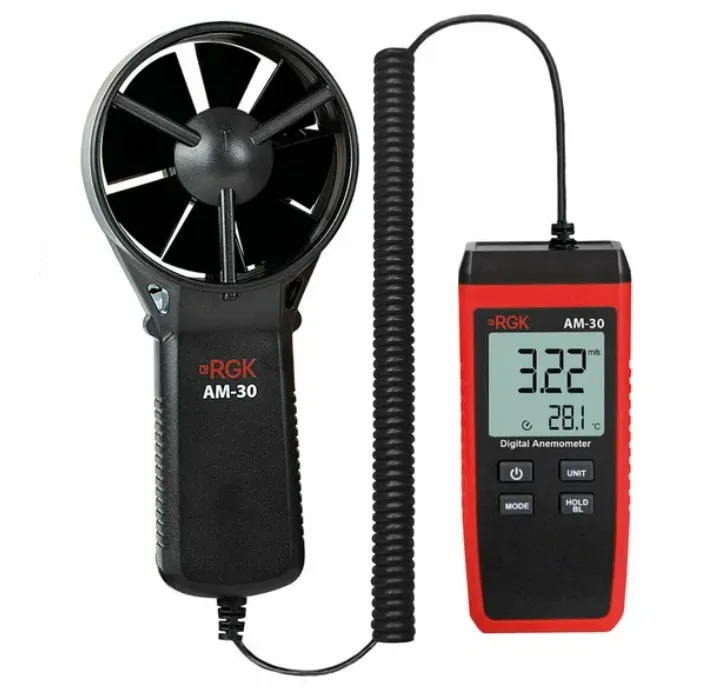 Термоанемометр RGK AM-30 предназначен для измерения скорости и температуры воздушного потока. Главное преимущество этой модели - выносная крыльчатка на гибком проводе, которая позволяет быстро и удобно проводить замеры на труднодоступных воздуховодах и вентиляционных выходах.