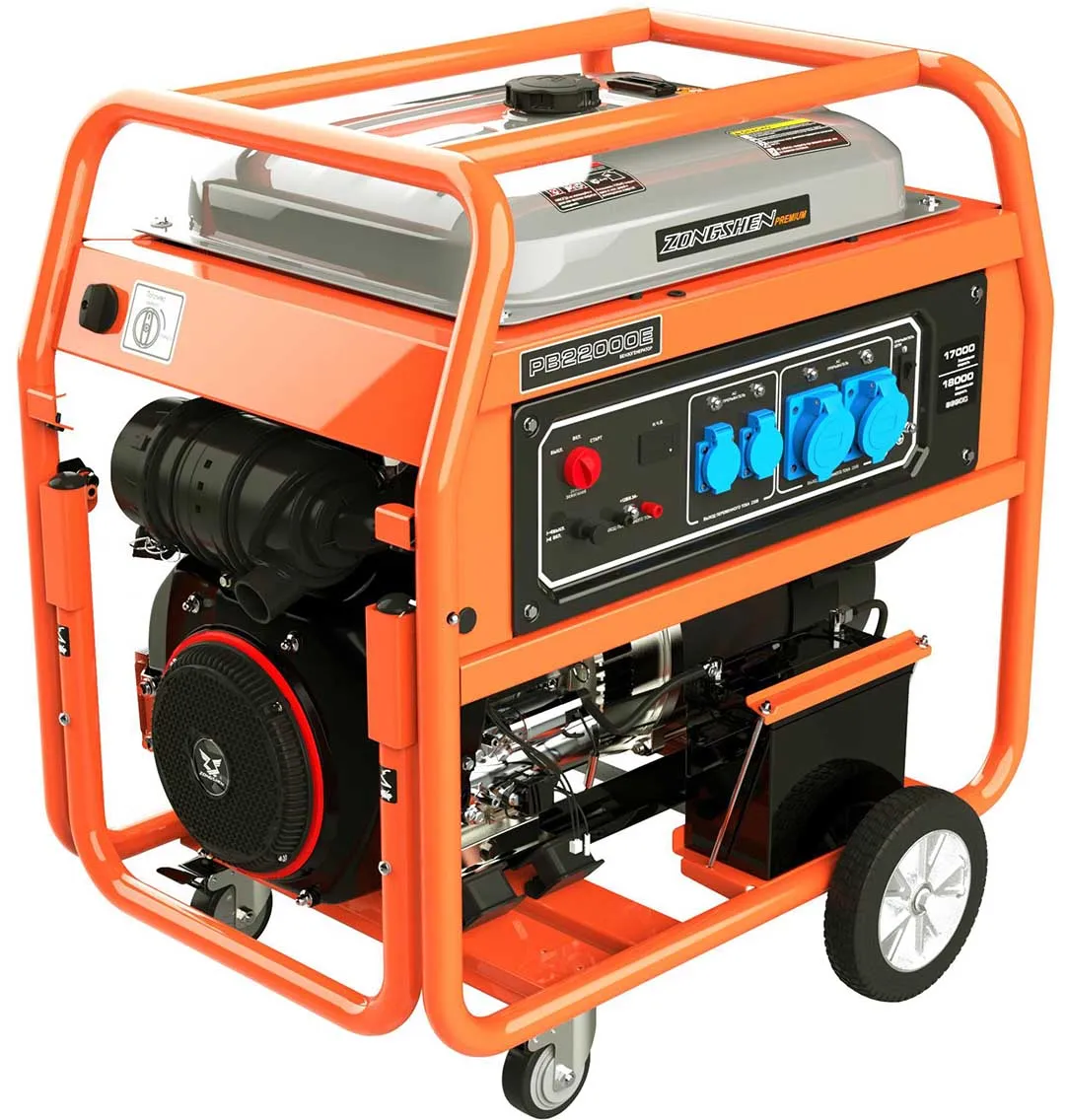 Генератор Zongshen PB 22000 E с двигателем GB 1000 (0.999 л) оборудован системой контроля уровня масла с авто остановкой, транзисторным зажиганием, системой декомпрессии. Длительная работа на одной заправке обеспечивается большим баком на 55 л. Имеются розетки: две 16А и две 32А. Генераторная установка оптимальна для небольшого бизнеса или загородного дома.
