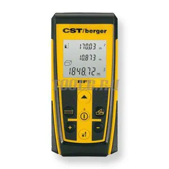 Лазерный дальномер CST/berger RF5 (F0340720N2). Рабочий диапазон 50 м, точность 1,5 мм, защита от пыли и влаги IP54, большой 3-х строчный дисплей с подсветкой, максимальное количество измерений:10000. Сложение, вычитание, площадь, объем, косвенное измерение, непрерывное измерение, 3 исходных плоскости (передняя, задняя, штатив). Устойчивость к падению с высоты 1 м