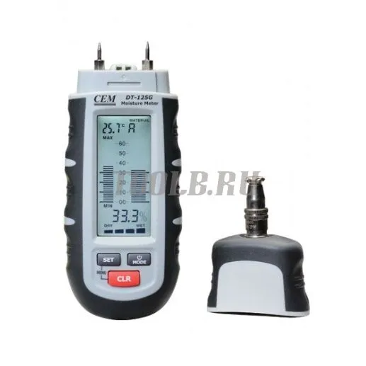 Измеритель влажности CEM DT-125G предназначен для быстрого определения уровня влажности древесины (а также бумаги и картона) и строительных материалов (цемента, бетона, строительного раствора и др.)