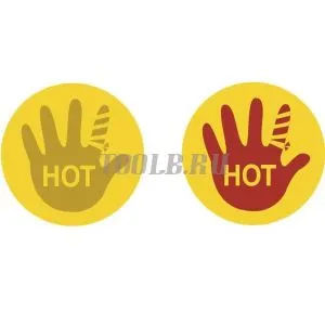 Индикатор температуры Hot Hands является обратимым. Они предупреждают об опасной температуре и тем самым защищают человека от ожогов при прикосновении к оборудованию. Если температура достигает +50 °C, то на индикаторе появляется ярко-красный значок руки с надписью "HOT ". Когда температура снижается - индикатор возвращается в исходное положение. Выдерживает максимальную температуру +90 °C.