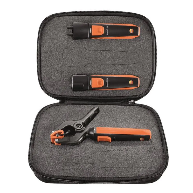 Комплект смарт-зондов для систем отопления, включающий термометр для труб (зажим) testo 115i, манометр дифференциального давления testo 510i и ИК-термометр testo 805i, идеален для специалистов по системам отопления для решения основных измерительных задач.