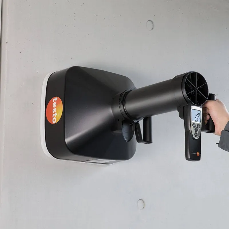 Компания Testo – единственный производитель измерительных решений для быстрых и одновременно высокоточных замеров на вихревых диффузорах. Оптимальную поддержку Вам окажет инновационный выпрямитель потока testovent 417, который преобразует турбулентный поток в практически равномерный, после чего все необходимые параметры можно измерить с помощью анемометра с крыльчаткой или многофункционального прибора с зондом-крыльчаткой. Результаты измерений без выпрямителя потока менее точные, т.к. вихревой поток по-разному влияет на вращение крыльчатки измерительного прибора, индицируется либо слишком высокая скорость потока, либо – слишком низкая (в зависимости от направления вращения вихревого потока относительно вращения крыльчатки). Выпрямитель потока можно использовать в сочетании набором с воронок testovent 417, анемометром testo 417 с крыльчаткой (Ø 100 мм), а также многофункциональными измерительными приборами testo 435 и testo 480, с зондом-крыльчаткой. Комплект состоит из выпрямителя потока и набора измерительных воронок testovent 417, который в свою очередь состоит из двух воронок разного размера.