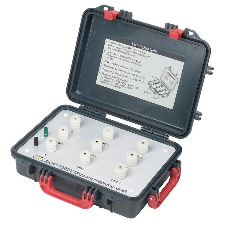 Магазин сопротивлений высокоомный: 1/10/100 МОм /1/10/100/500 ГОм (± 1 %); макс. до 10 кВ пост. (макс. 3 Вт); в удобном кейсе; масса 3,1 кг