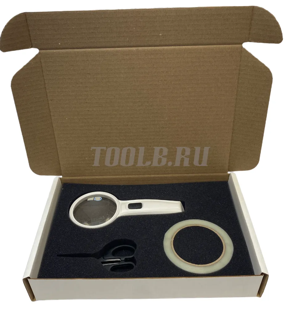 Линза увеличительной лупы выполнена из оптического полимера, что не приводит ее к помутнению в процессе пользования набором. Один комплект батарей рассчитан на использование подсветки в течении 30 часов непрерывного свечения (в зависимости от типа батарей).