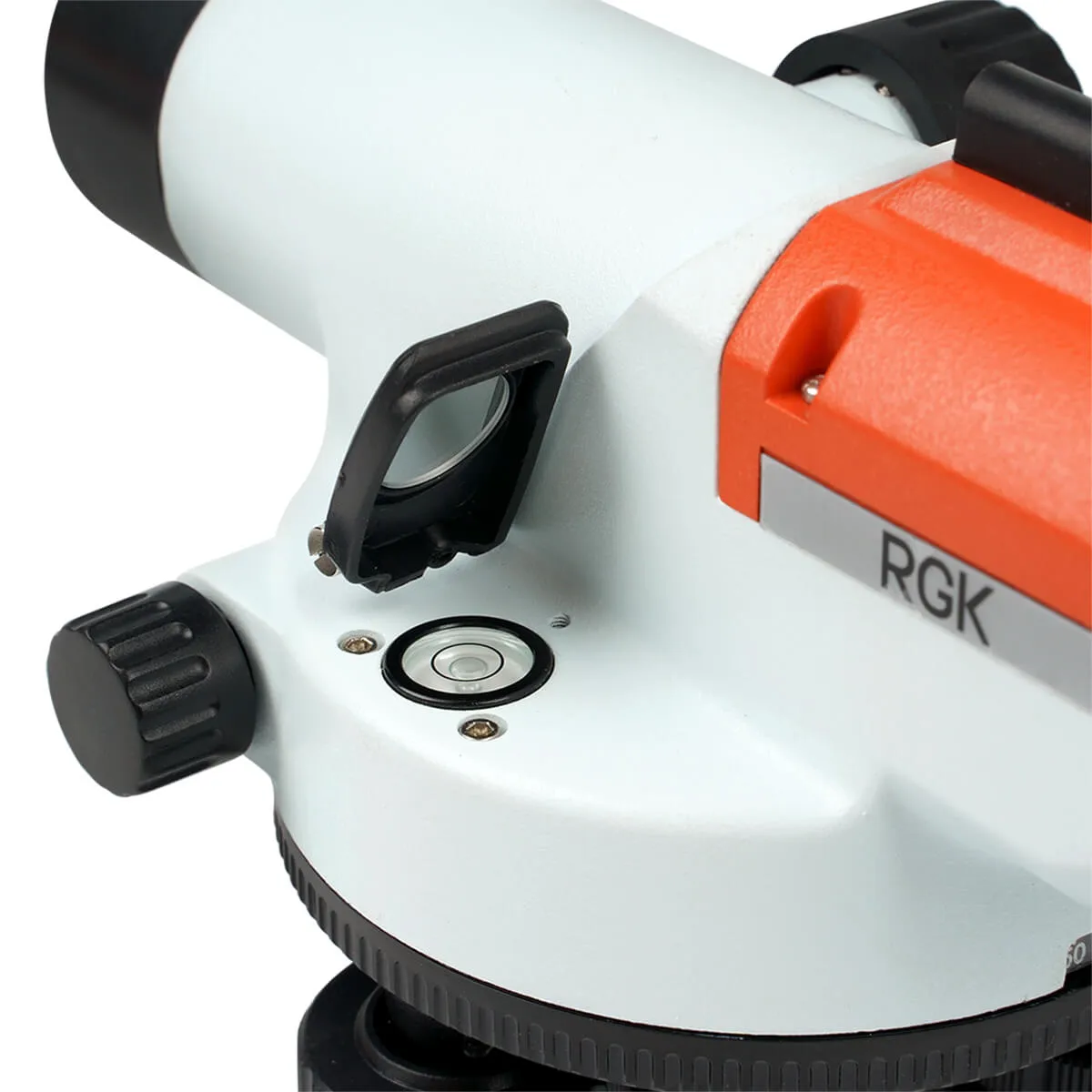 Стандартная комплектация: оптический нивелир RGK C-24, нитяной отвес, юстировочный набор, руководство по эксплуатации, транспортировочный кейс.