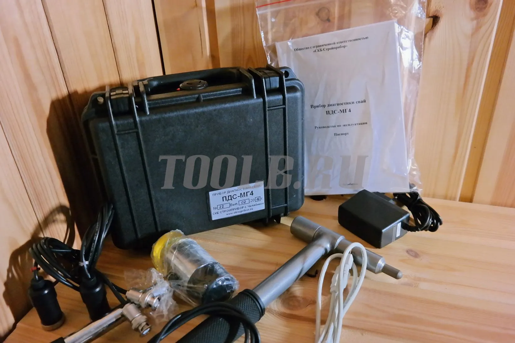 Ультразвуковой дефектоскоп диагностики свай ПДС-МГ4 состоит из электронного блока, размещенного в ударопрочном корпусе фирмы PELI, из одного или двух (в зависимости от комплектации) сейсмоприемников, молотка с демпфером. По спецзаказу поставляются: молоток со встроенным пьезодатчиком для контроля силы удара; приспособления для установки датчиков на грунт; темпер для возбуждения упругих волн в грунте.
