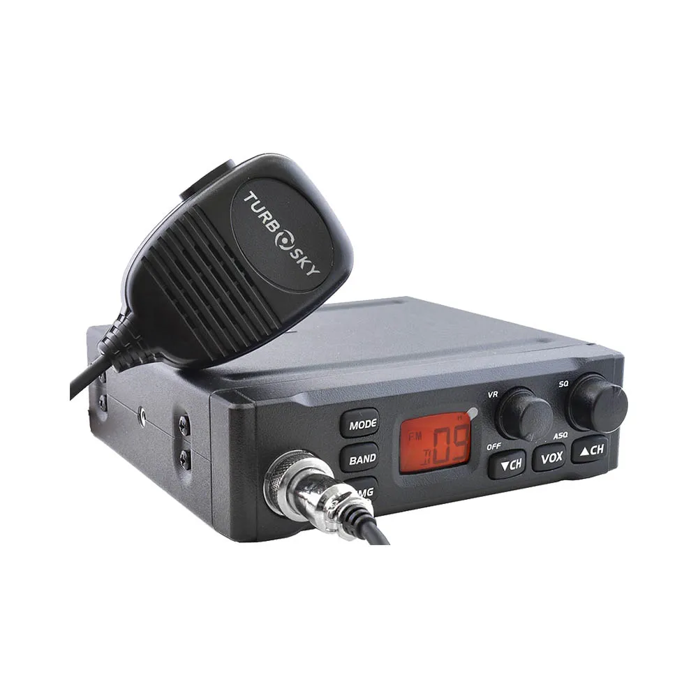 Turbosky CB-3 - мобильная радиостанция СИ-БИ диапазона, работающая в частотах 26,965 - 27,410 МГц, имеющая в комплекте тангенту, провода для подключения и запчасти для крепления.