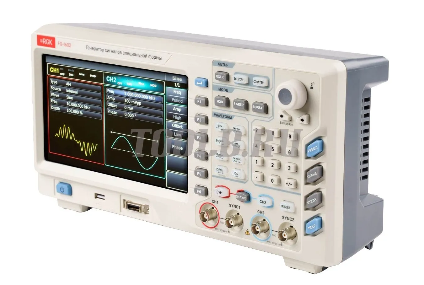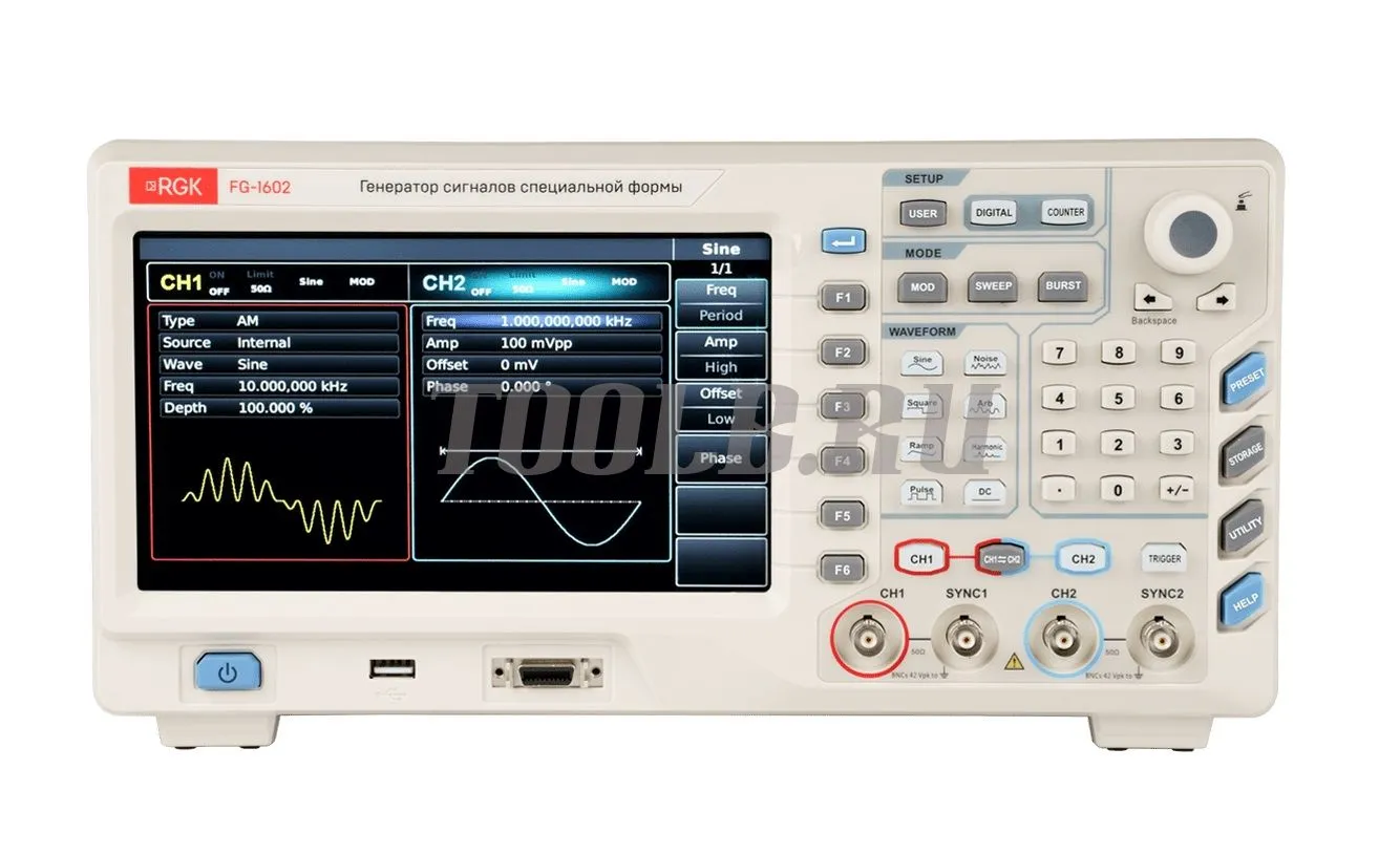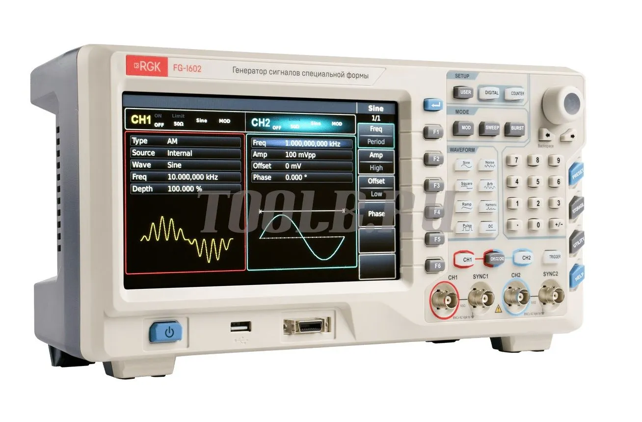 Генератор сигналов специальной формы RGK FG-1602 использует технологию прямого цифрового синтеза (DDS) для получения точных и стабильных сигналов с разрешением по частоте до 1 мкГц. Прибор является экономичным, высокопроизводительным, многофункциональным двухканальным генератором сигналов произвольной формы.