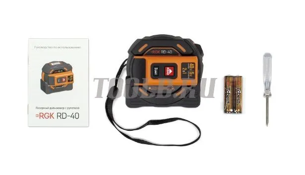 Комплект поставки лазерного дальномера с рулеткой RGK RD-40: