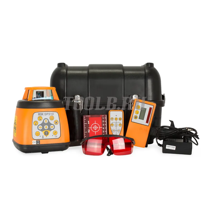 Стандартная комплектация: Ротационный лазерный нивелир RGK SP310, приемник излучения, пульт дистанционного управления, кронштейн для установки приемника излучения на рейку, магнитная мишень, руководство пользователя на русском языке, футляр,очки, зарядное устройство.