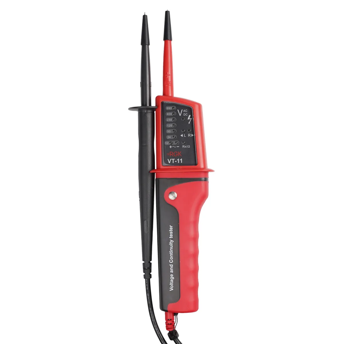 Цифровой тестер напряжения RGK VT-11 - это компактный и удобный в работе прибор, который позволяет быстро определить наличие тока в проводнике, цепи или розетке, а также примерно оценить величину напряжения в диапазоне от 12 до 690 В. Оборудование такого типа чаще всего применяется при ремонте бытовых электросетей, систем освещения и различной электроники.