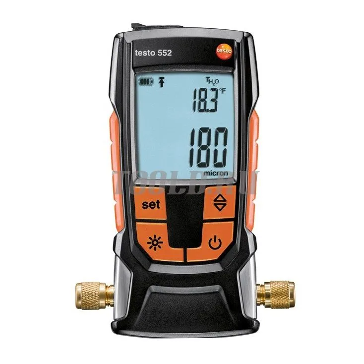 Testo 552 представляет собой прецизионный электронный манометр, который предназначен для измерения давления в сверхнизком диапазоне при выполнении вакуумирования холодильных агрегатов, кондиционеров, тепловых насосов и т.п. Вакуумметр Testo 552 может использоваться, как отдельный измеритель или в качестве подключаемого зонда совместно с манометрическим коллектором Testo 570 через интерфейс MiniDIN. Особенностью цифрового вакуумметра Testo 552 является использование в качестве датчика абсолютного давления высокоточного сенсора, который не требует специального ухода и сервисного обслуживания.