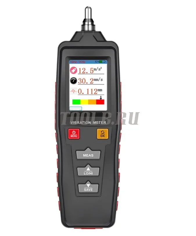 - Виброметр оснащен следующими функциями: выбор диапазона частоты вибрации, индикация заряда батарей, автовыключение, память измерений.