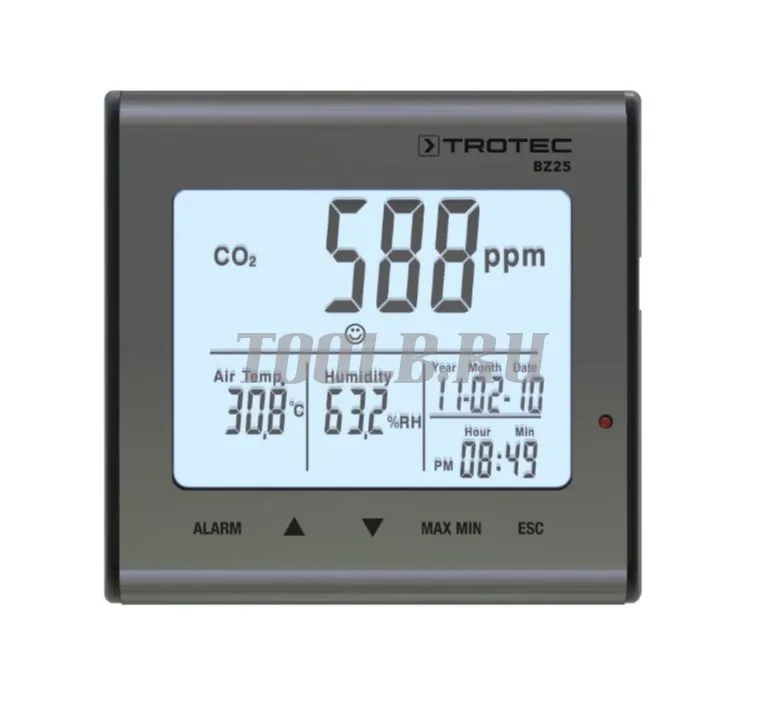 Повышенные концентрации углекислого газа, даже если они находятся в пределах допустимых предельных значений, могут не только привести к усталости, снижению концентрации и производительности, но и вызвать серьезные проблемы со здоровьем, особенно для детей или ослабленных людей. С помощью Trotec BZ25 можно надежно контролировать качество воздуха в помещении, это идеальный прибор для использования в рабочих, жилых или детских комнатах, классах школ, детских садах. Trotec BZ25 в дополнение к температуре воздуха и относительной влажности также фиксирует текущую концентрацию углекислого газа в воздухе помещения и показывает это с шагом 1 ppm на легко читаемом дисплее. Кроме того, можно установить предельное значение CO₂, при превышении которого издается звуковой предупреждающий сигнал.
