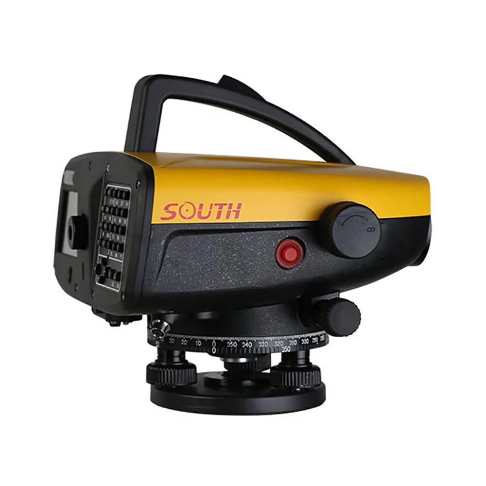 SOUTH DL-2003A оборудован системой компенсации с магнитным демпфером, которая сглаживает небольшие неровности грунта под штативом и погрешности установки. Кнопка запуска измерения вынесена на правую сторону корпуса и расположена рядом с фокусировочным винтом, что очень удобно. Для проведения замера и отображения результата нивелиру требуется не больше 3 секунд.