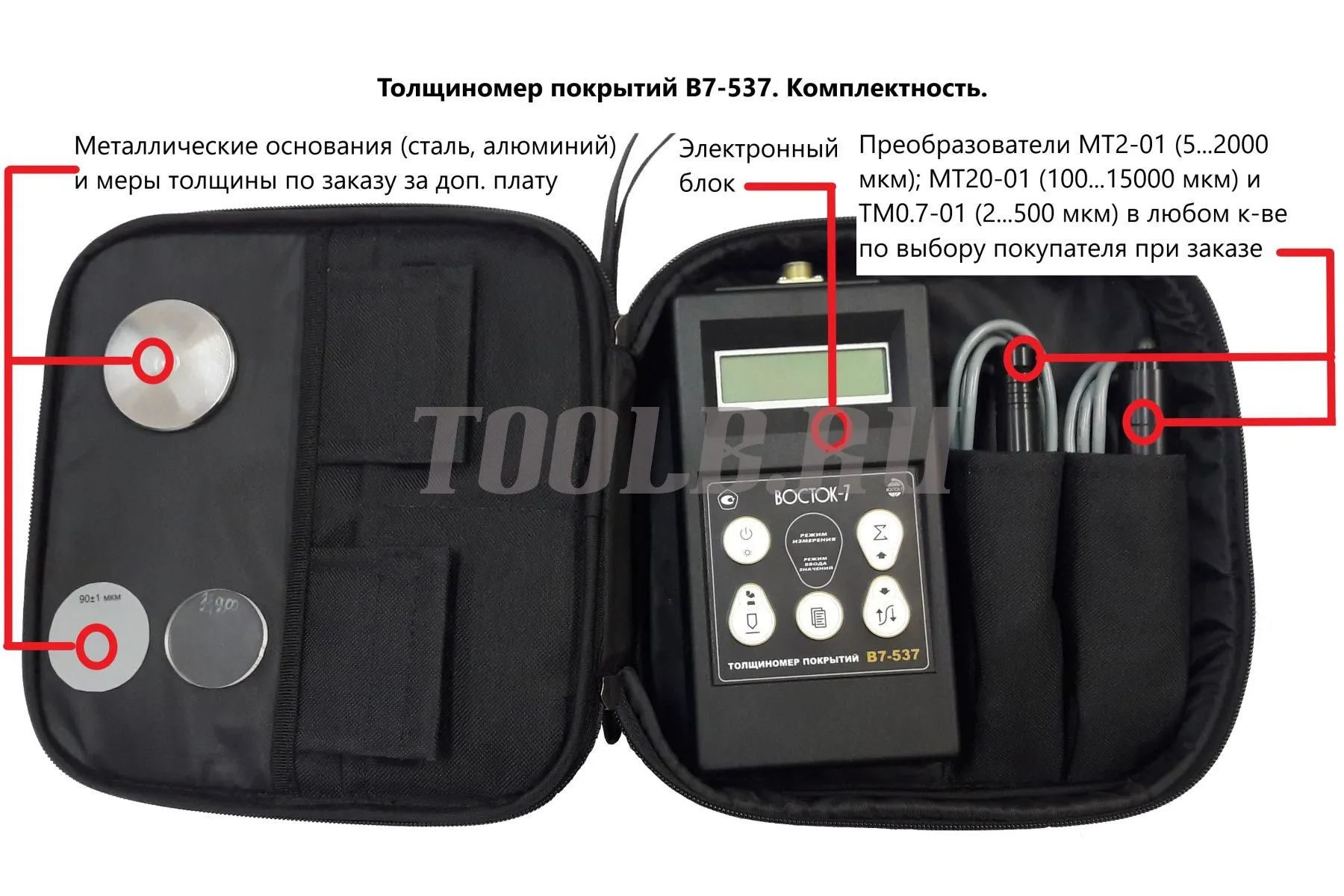 Толщиномеры покрытий В7-537 с выносным (съёмным) датчиком применяются для измерений толщины немагнитных диэлектрических покрытий (напр. лаки, краски и др. диэлектрики) или немагнитных проводящих (гальванических как цинк, хром, серебро, кадмий, алюминий, медь и др.) покрытий, нанесённых на ферромагнитное основание.