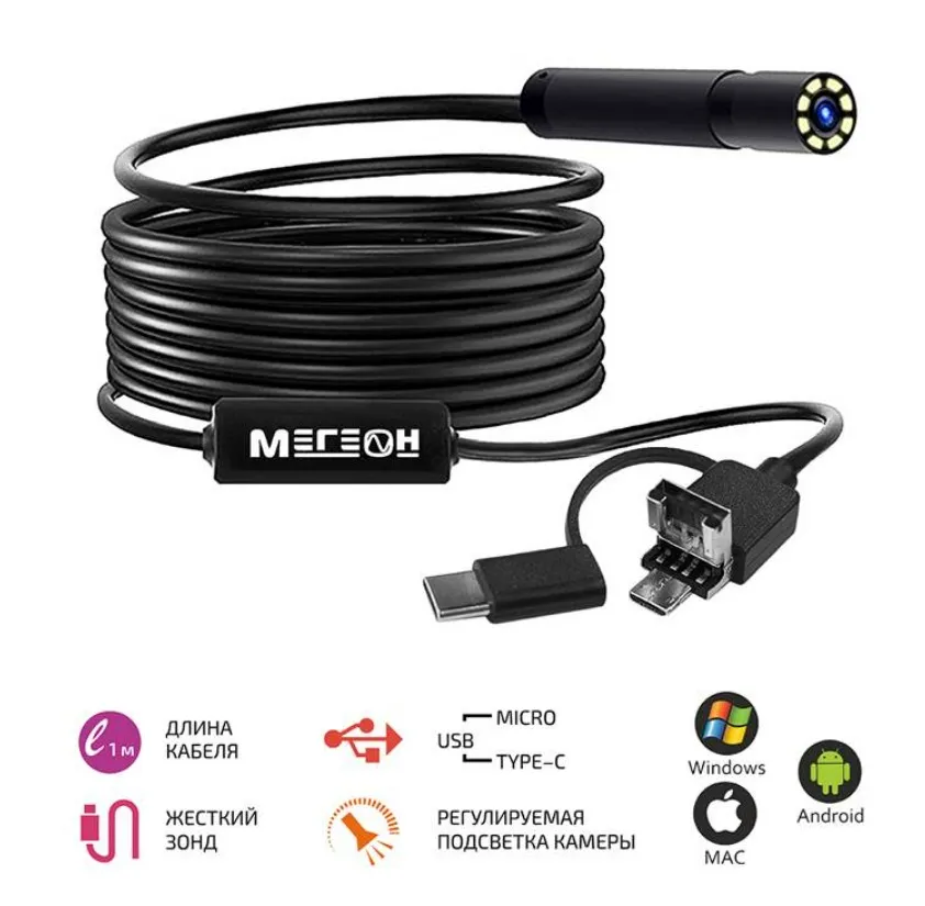 МЕГЕОН 33014 – это многофункциональный видеоскоп с ультратонкой камерой диаметром пять с половиной миллиметров, полужёстким зондом длиной 1 метр, оснащён универсальной вилкой три в одной позволяющей без использования сторонних переходников подключать его к гнёздам USB, microUSB и USB-type-C. Видеокамера высокой чёткости с защитой (IP67), со встроенной регулируемой светодиодной подсветкой, автоматической регулировкой фокуса и яркости. Он не требует источника питания так как подключается к порту и питается от него. В комплекте поставки: съёмное зеркало (перископ) для обзора по бокам, магнитный держатель и крючок для возможности извлечь упавшую деталь. В зависимости от используемого ПО возможна видео- и фотофиксация изображения. Прибор найдёт широчайшее применение там, где в труднодоступных местах нужно увидеть без дополнительной разборки.