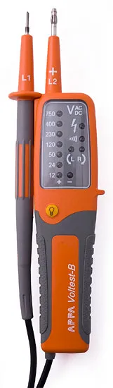 Пробник-тестер напряжения (пост./перем - автовыбор): 12/ 24/ 50/ 120/ 230/ 400/ 750 В (св.диод. шкала), рабочий диапазон 50…60 Гц; прозвон цепи 0…600 кОм, тест УЗО (0,2 Апик; преднамеренное размыкание); индикация полярности напряжения (DC); индикация фазного напряжения в 1ф сети и направления чередования фаз; с/д подсветка зоны измерения; автовключение (> 12В) и автовыключение питания, режим самодиагностики, исполнение IP65, питание 1,5 В×2 (тип ААА); 52×239×29 мм; масса 220 гПробник-тестер напряжения (пост./перем - автовыбор): 12/ 24/ 50/ 120/ 230/ 400/ 750 В (св.диод. шкала), рабочий диапазон 50…60 Гц; прозвон цепи 0…600 кОм, тест УЗО (0,2 Апик; преднамеренное размыкание); индикация полярности напряжения (DC); индикация фазного напряжения в 1ф сети и направления чередования фаз; с/д подсветка зоны измерения; автовключение (> 12В) и автовыключение питания, режим самодиагностики, исполнение IP65, питание 1,5 В×2 (тип ААА); 52×239×29 мм; масса 220 г