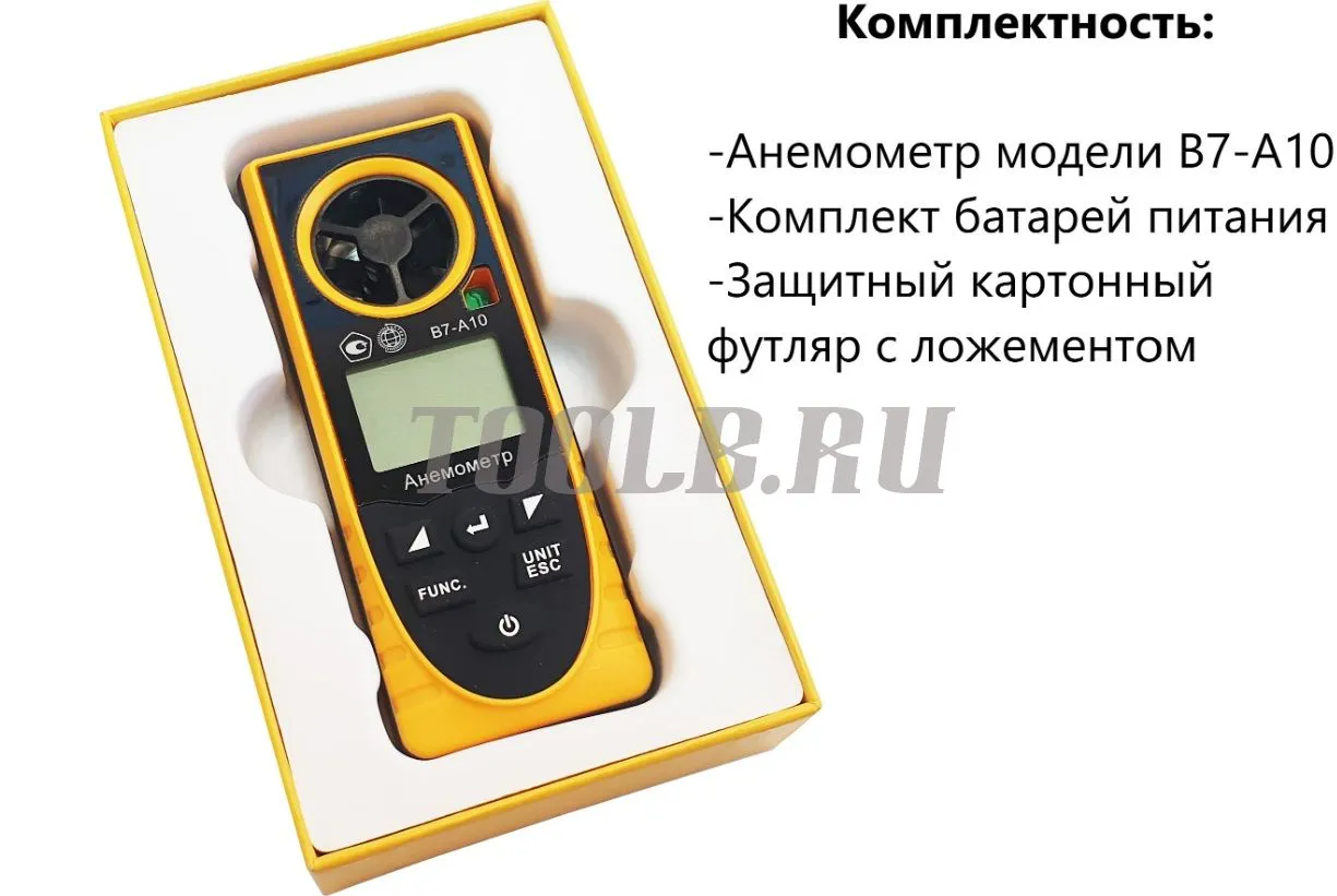 Модификация В7-А10 (термоанемометр + гигрометр, встроенный зонд-крыльчатка, каналы индикации точки росы, атмосферного давления, абсолютной высоты, уровня освещённости, холодного потока) представляет собой мобильный многофункциональный микропроцессорный анемометр ручного формата. Он состоит из электронного блока, совмещённого с измерительным зондом – моноблочного типа. Применяется для измерения температуры, относительной влажности, точки росы, атмосферного давления, высоты над уровнем моря (абсолютной высоты), уровня освещённости и скорости направленного воздушного потока и других газов в вентиляционных каналах и системах кондиционирования с вычислением объёма расхода, средних, максимальных и минимальных параметров воздушного потока.
